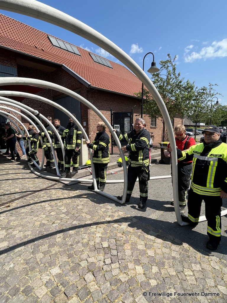 Aus diesem Grund wurde von den Kameraden der Feuerwehr Damme, vor der Scheune Leiber, mit einer Schlauchspirale Spalier gestanden. Außerdem wurde ihnen der St. Florian überreicht.