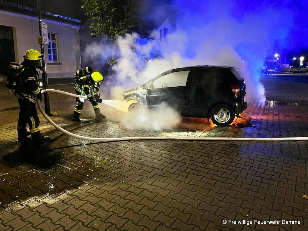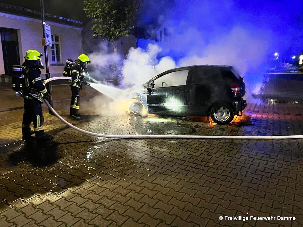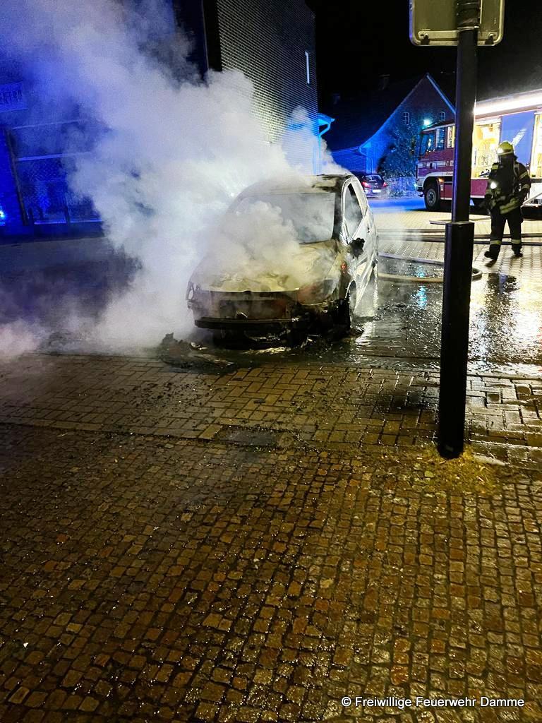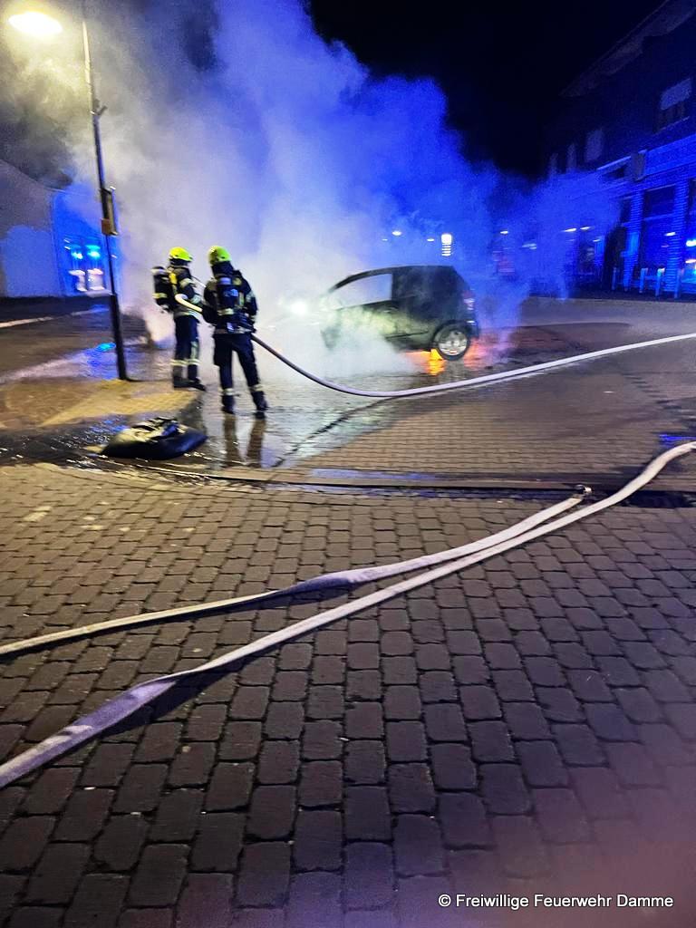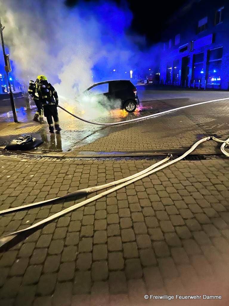 Um 01:38 wurde die Feuerwehr Damme zu einem PKW Brand auf der Großen Straßen in Damme, auf dem Parkplatz vor dem Expert Markt, gegenüber der Polizeistation Damme, alarmiert.