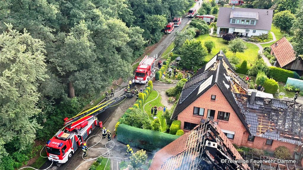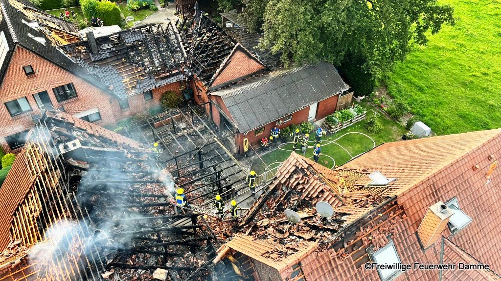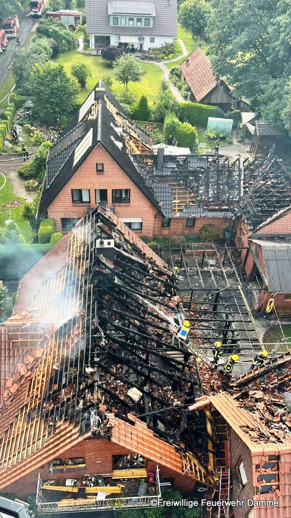 Aufgrund der Lage wurde das Einsatzstichwort auf Feuer 4 erhöht und weitere Feuerwehren aus Südlohne, Brockdorf, die Drehleitereinheit aus Damme, die Drohnengruppe des LK Vechta sowie der ELW 2 des LK Vechta alarmiert.