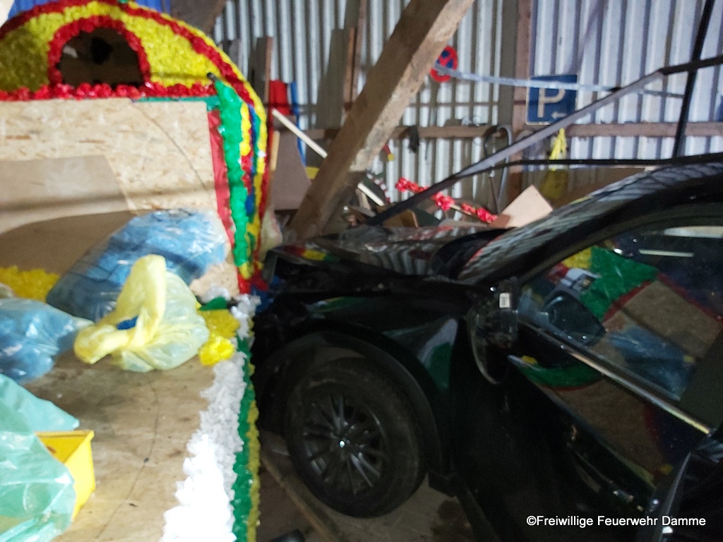 Ein PKW war nach links von der Straße abgekommen, über einen Erdwall gefahren und anschließend in eine Lagerhalle katapultiert worden. Dabei wurde der PKW unter dem großen Hallentor, welches aus Stahlblechplatten bestand, begraben und die Fahrerin in ihrem PKW eingeschlossen.