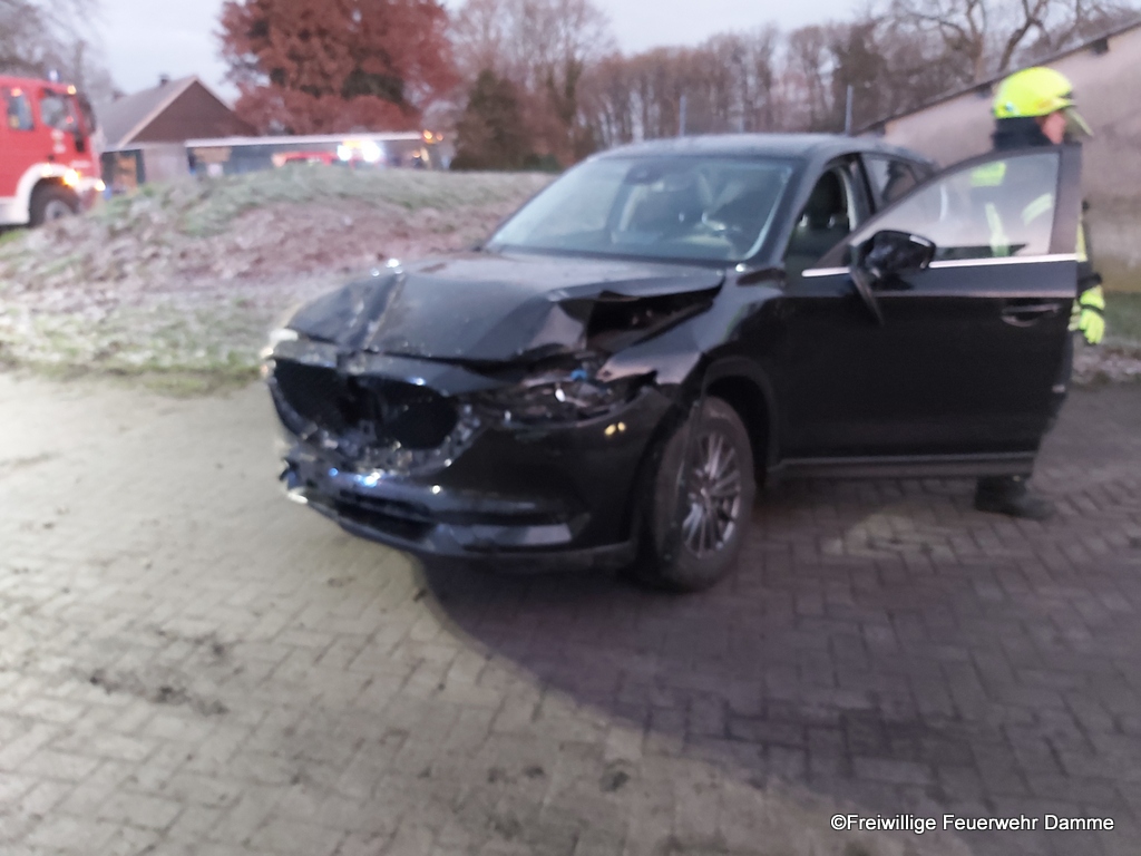 Um 06:46 wurde die Feuerwehr Damme, zusammen mit der Feuerwehr Borringhausen, zu einem Verkehrsunfall mit eingeklemmter Person auf der Straße Kemphausen in Damme- Kemphausen alarmiert.